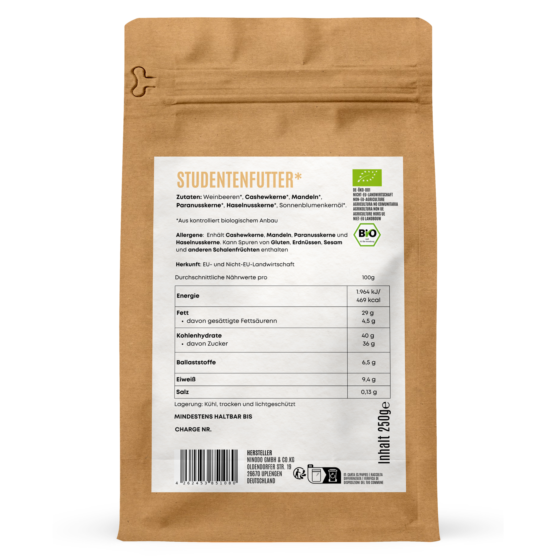 Unser Bio Studentenfutter vereint das Beste aus Nüssen und Trockenfrüchten in einer ausgewogenen Mischung. Diese zeitlose Kombination aus süßen Bio-Weinbeeren und knackigen Bio-Nüssen ist der perfekte Begleiter für Studium, Arbeit und Freizeit - für alle, die Wert auf natürliche Qualität legen.