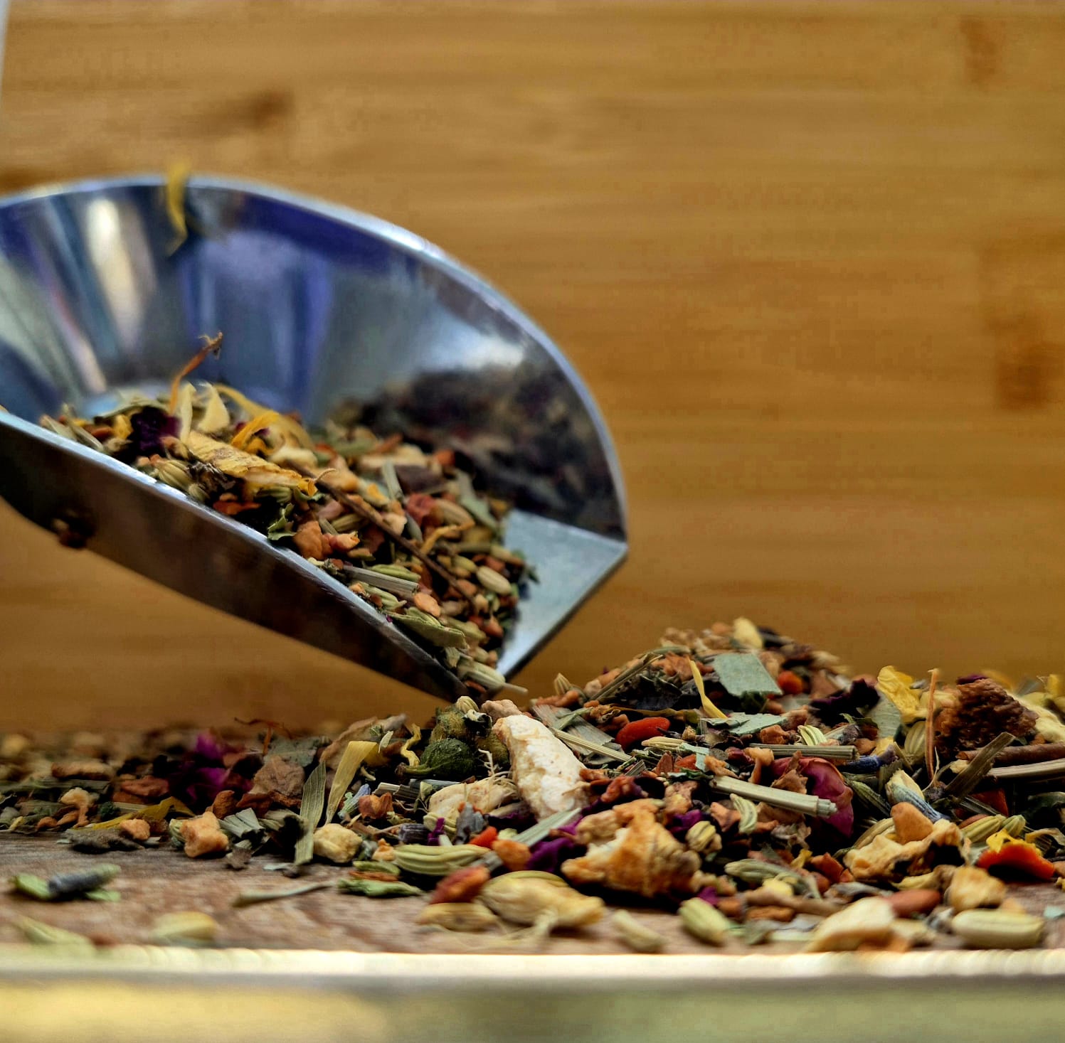 Zutaten: Apfelstücke, Fenchel, Ingwerstücke, Orangenschalen, Zitronengras, Karottenflocken, Eukalyptusblätter, Zimtstücke, Zitronenverbenenblätter, Rosenknospen, Brombeerblätter, schwarzer Pfeffer, Rosenblüten, Himbeerblätter, Ringelblumenblüten, Basilikum, Lavendelblüten, Rote Bete