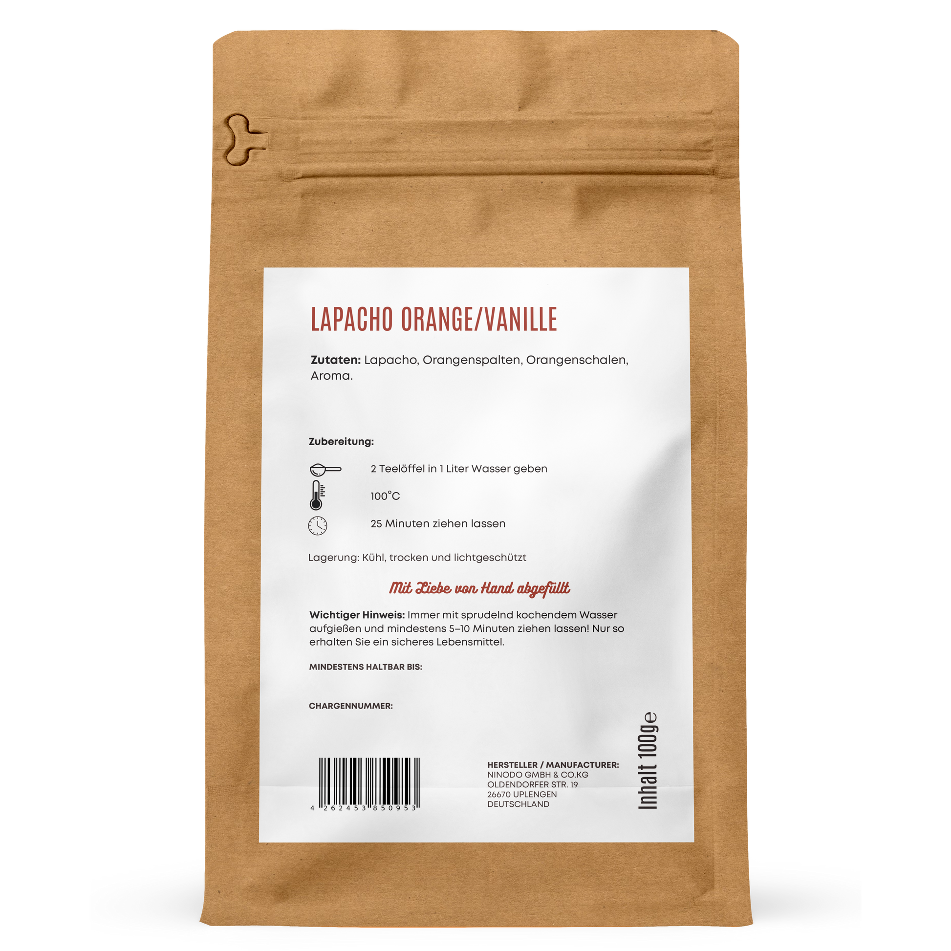 Entdecken Sie unseren aromatischen Lapacho Orange/Vanille - eine harmonische Verbindung aus dem traditionellen Regenwald-Tee und fruchtiger Süße. Diese besondere Mischung vereint die erdigen, leicht süßlichen Noten des südamerikanischen Lapacho-Baumes mit der spritzigen Frische von Orange und der samtigen Wärme von Vanille.