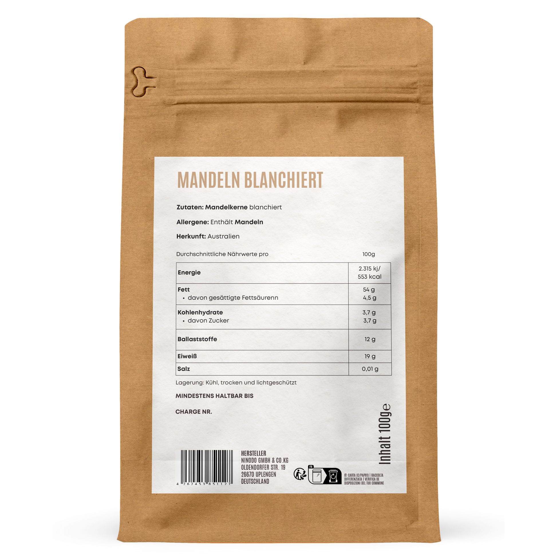 Zutaten: 100% blanchierte Mandeln aus Australien